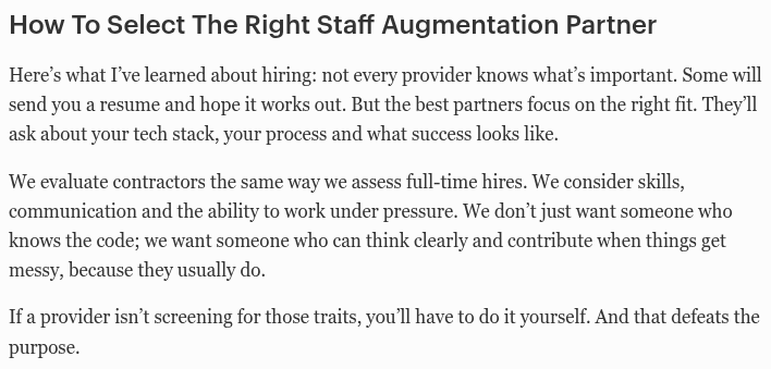 Enterprises running Agile software projects, tech startups, or mid-sized businesses that require flexible capacity and specialized skill sets benefit the most. - How do we evaluate the effectiveness of augmented professionals?